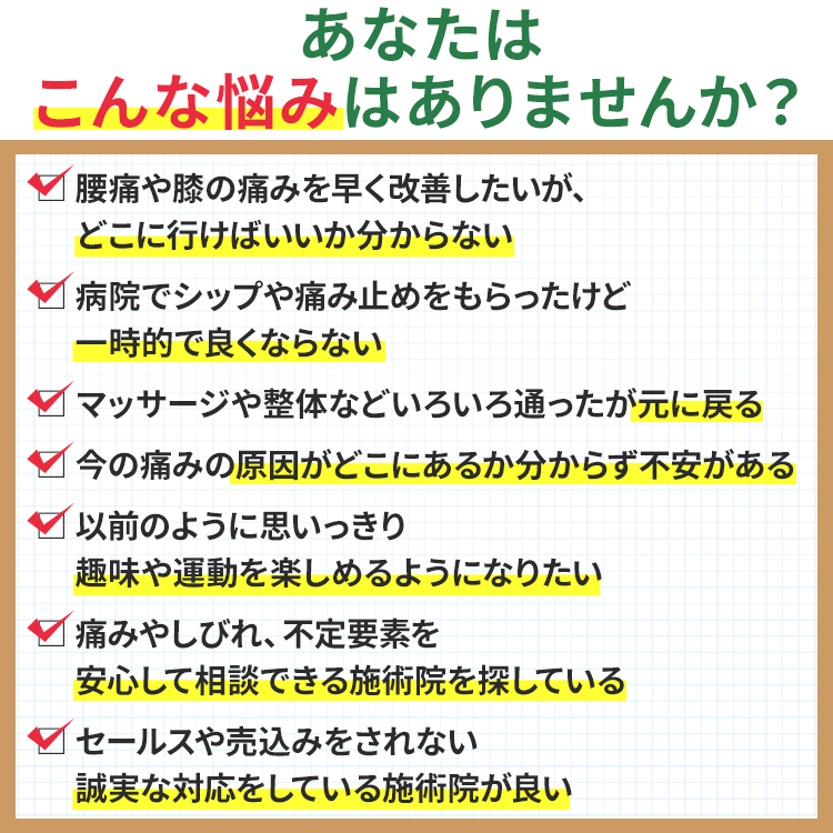 腰椎椎間板ヘルニア/慢性腰痛/脊柱管狭窄症/腰椎分離症/腰椎すべり症/坐骨神経痛/梨状筋症候群/尾骨痛/産後腰痛膝・足首・下肢