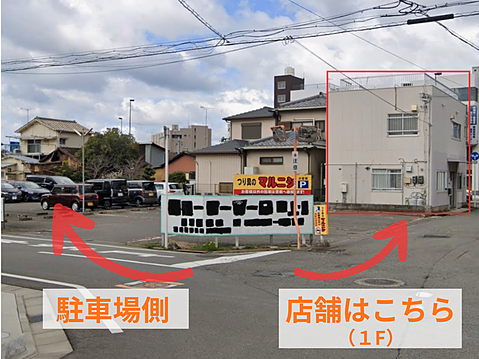 画面向かって左側に店舗。右側に釣具マルニシさんの駐車場看板があります。