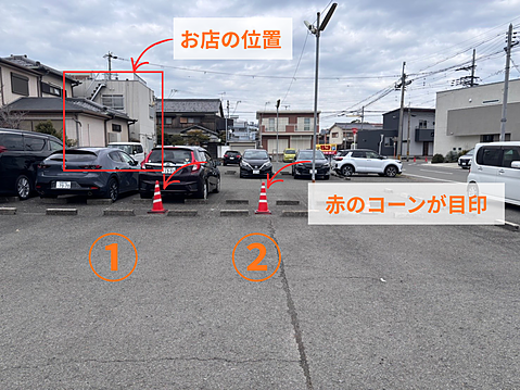 2. ①と②の空いているほうに駐車をお願いいたします。(赤のコーンが目印)